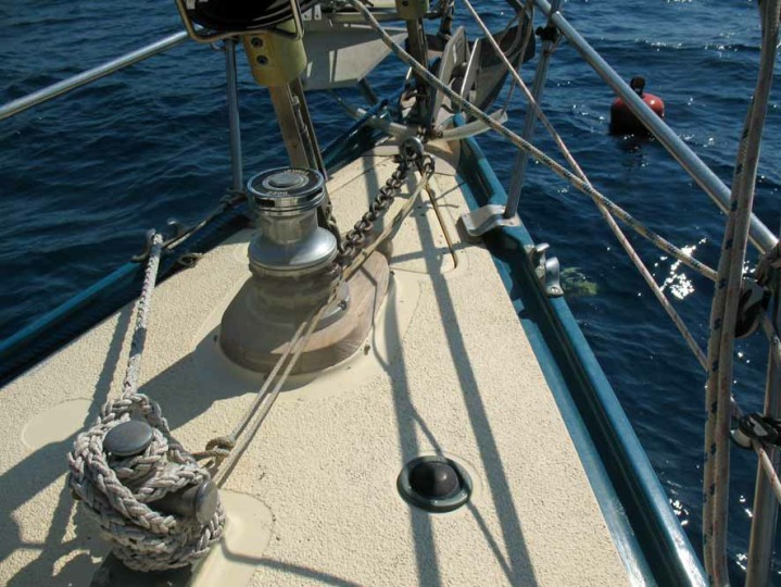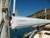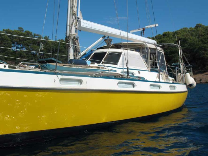 In 2014 the hull was taken back to the gel coat, primed and then painted with 6 coats of International 2 part paint. Below the waterline all old anti-fouling was removed back to the gel coat, (no osmosis found) sealed, primed and 2 coats of Seahawk anti-fouling applied. Also the teal deck stripe was repainted with 2 part paint. Susequently antifouled in 2016.