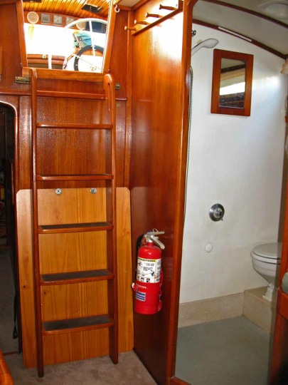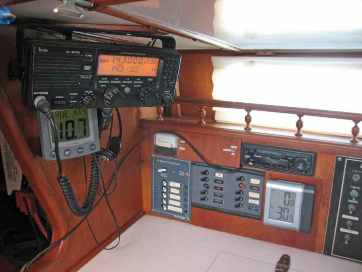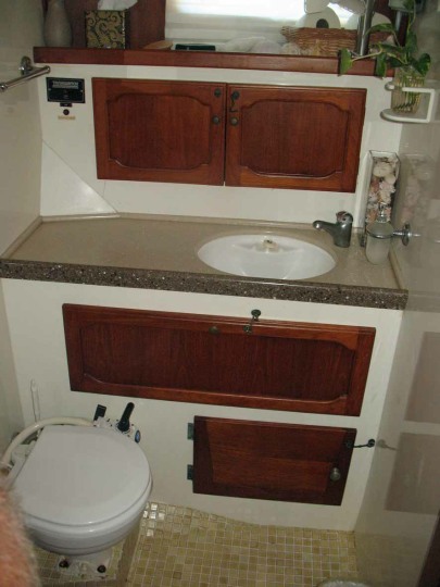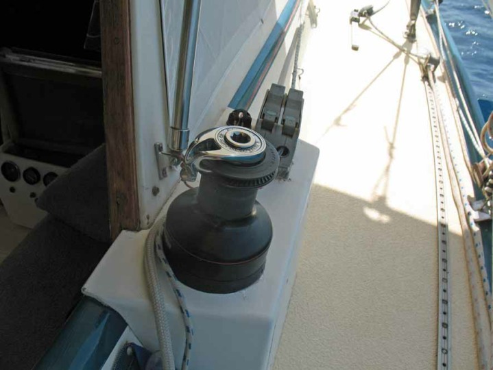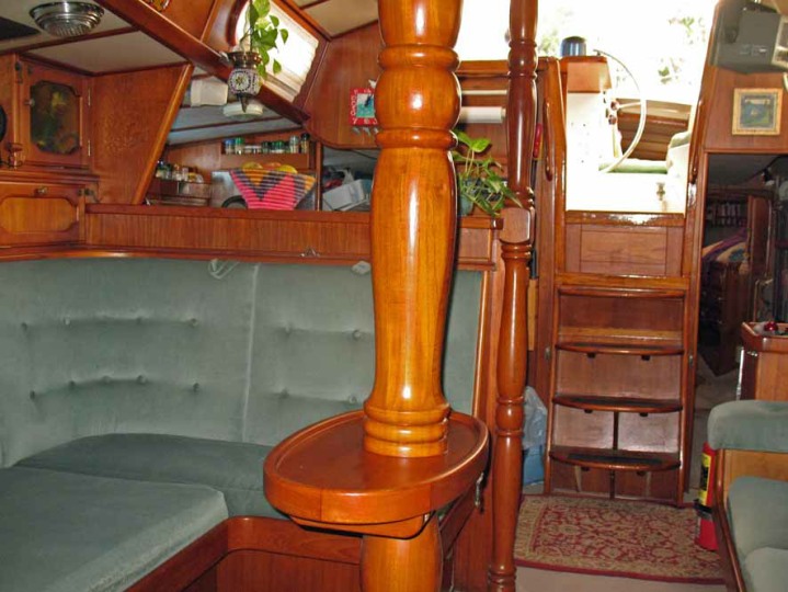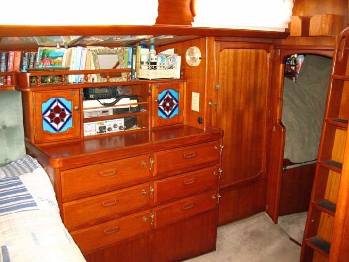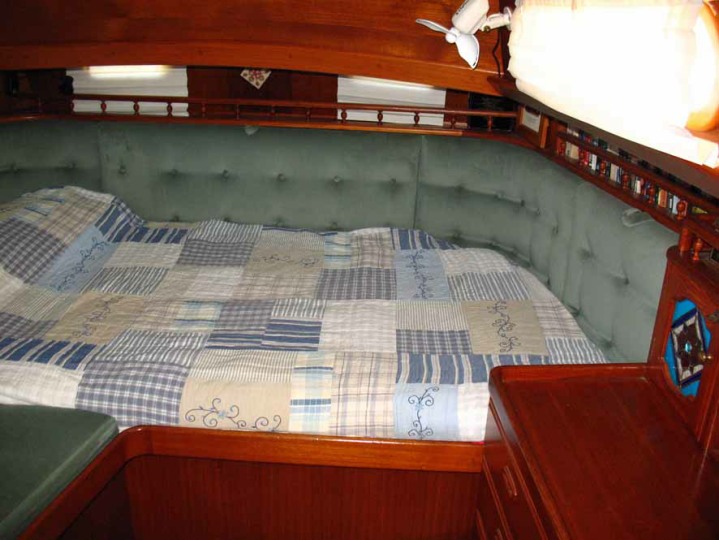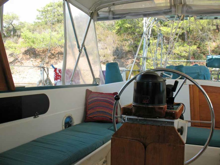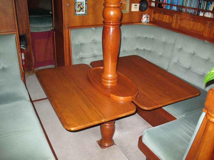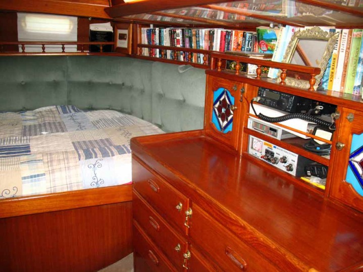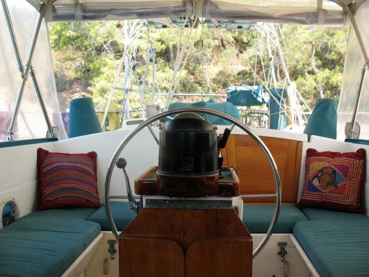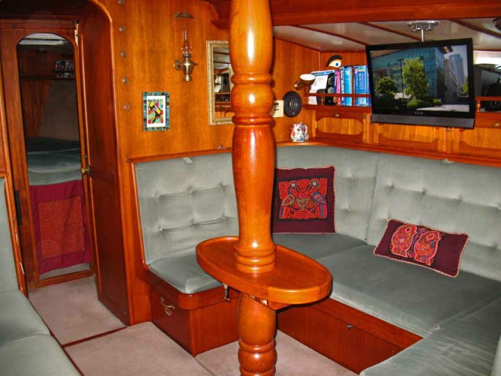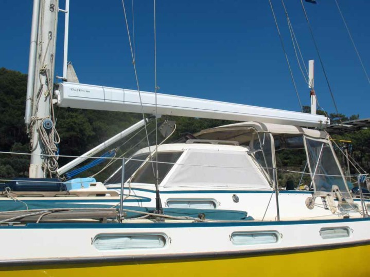 The centre cockpit design features an original factory-built hard dodger with fully enclosed canvas bimini. The fully enclosed cockpit provides extra comfort whether under way or on anchor. There is no need to wear wet-weather gear while sailing as all sail handling is done from within the cockpit. An electric winch makes handling of the boom furling main and head sail easy. The fully enclosed cockpit also creates an extra room on anchor, during wet weather etc. As well as being very safe with it’s high combing, the centre cockpit design also allows very easy access to both sides of the engine.