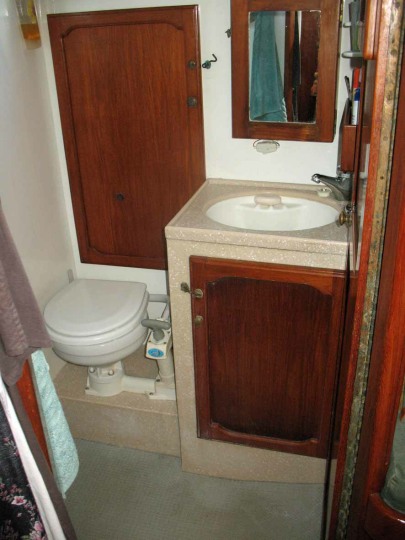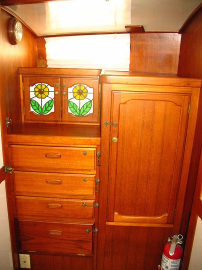 Storage on board is exceptional with not a spare inch wasted and most of it easily accessible. Sunflower has been set up as a comfortable home for 2 people although, we have regularly hosted guests in the double V berth which has it’s own dressing area and head. We enjoy our comfort so there is a slim line TV which folds up against the ceiling when not in use, we have Carframo fans in each bedroom, the forward head and 2 in the living area, there are also a couple of portables which plug into 12 volt sockets if extra cooling is required in the cockpit. There is a twin-tub washing machine on board which stows neatly in the ‘tunnel’ between the main salon and master bedroom in the rear. It is very lightweight and is easily moved in to the main shower area for use. A 50 litre per hour Echotec water maker ensures a plentiful supply of shower, or any, water! A double filtration system means our drinking water tastes better than most bottled water.